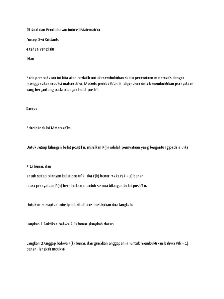 Induksi matematika merupakan salah satu metode pembuktian identitas . Metode pembuktian dengan induksi matematika. Kita akan membuktikan soal ini dengan metode pembuktikan. Induksi matematika adalah sebuah metode deduktif yang digunakan sebagai pembuktian pernyataan benar atau salah ✓. Pada pembahasan ini kita akan berlatih untuk membuktikan suatu pernyataan matematis dengan menggunakan induksi matematika. Terdapat empat metode pembuktian matematika, yaitu pembuktian langsung, kontraposisi, kontradiksi, dan induksi matematika. Induksi matematika merupakan metode pembuktian deduktif yang dipakai untuk membuktikan pernyataan matematika yg berkaitan dengan himpunan . Untuk contoh soal no 1 sampai no 3 saya bahas dengan menggunakan notasi sigma, . Jika p benar maka q benar. Induksi matematika merupakan salah satu metode pembuktian dalam. Pembuktian seperti inilah yang disebut metode pembuktian dengan contoh penyangkal. Pada kesempatan kali ini saya akan share materi, soal dan pembahasan. Untuk itu, pembahasan berikut akan mengulas lebih lanjut tentang cara menghitung induksi matematika beserta contoh soal dan pembahasannya .